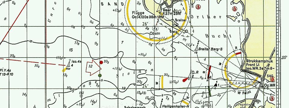 An einem schönen Morgen im Jahr 2013 segeln wir auf der Nordsee. Es herrscht ein frischer Wind aus S, die Sicht ist gut, einem schönen Segeltag steht also nichts im Wege. 1. Um 09:35h werfen wir einen Blick aufs GPS, das uns unsere Position mit 54°06,1N 008°08,9E angibt. Diese zeichnen wir in die Seekarte ein und schreiben daneben Ob 9:35. 2. Wir fahren von hier aus einen rechtweisenden Kurs von 255 Grad. Zeichne ihn in die Seekarte. 3. Kurz nach 11h zeichnen wir unsere geschätzte Position in die Seekarte ein: etwa 9sm vom Ausgangspunkt und schreiben daneben Ok 11:05. Wie lautet der Koppelort? 4. Wie schnell waren wir so ungefähr unterwegs? 5. Wir gehen durch die Wende und fahren von hier aus am Magnetkompass einen Kurs von 096 Grad. Zeichne den rwK in die Seekarte (Ablenkung lt. Rückseite Begleitheft!). 6. Wo glauben wir um 12:05 zu sein unter der Annahme, dass unsere Geschwindigkeit ungefähr konstant ist und gut gesteuert wurde? Trage den Ok 12:05 in die Seekarte ein. 7. Wir kontrollieren unsere Position und peilen die Tonne Robben-Plate am Magnetkompass mit 256 Grad und die Tonne Kalfamergat mit 124 Grad. Bei beiden Messungen liegt ein MgK = 100° an. Wie lautet der Ob 12:05? Und was sind das eigentlich für Tonnen? 8. Wie lautet die Besteckversetzung BV=Ok→Ob? 9. Lt. Leuchtfeuerverzeichnis befindet sich der Leuchtturm Nordersand auf Position 53°55N 007°52E, leider hat man vergessen, ihn in die Seekarte einzuzeichnen. Das holen wir nach. 10. Von hier aus steuern wir also Nordersand direkt an. Wie lautet der rwK? 11. Und welchen MgK sollte der Rudergänger steuern? 12. Wann werden wir Nordersand ungefähr erreichen, wenn wir annehmen, dass unsere Geschwindigkeit in etwa konstant ist? 13. Wir erreichen den Leuchtturm Nordersand erst um 13:45 Uhr. Schreibe Ob 13:45 neben den Leuchtturm; wie schnell waren wir unterwegs? 14. Wieder gehen wir durch die Wende und fahren von hier aus am Magnetkompass einen Kurs von 096 Grad. Wie lautet der Ok 14:55 bei konstanter Geschwindigkeit? 15. Jetzt peilen wir Robben-Plate am Magnetkompass mit 304 Grad und Kalfamergat in 015 Grad. Am Magnetkompass lag bei den Messungen 100° an. Wie lautet die BV? 16. Wir wollen zurück zum Ausgangspunkt unserer Reise. Wie lautet der MgK? 17. Wegen des frischen Rückenwinds rechnen wir nun mit 6,7kn. Wann werden wir ungefähr dort ankommen? Na? Alles geklappt? Ich hoffe doch...- → wer wir sind?