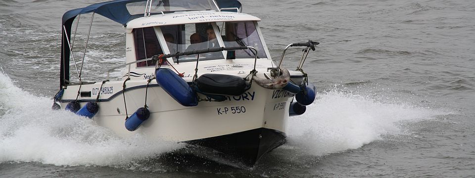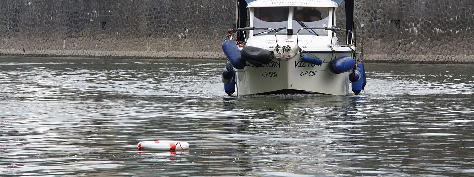 Geistesgegenwärtig reagiert der Rudergänger: Gang raus, Ruder nach rechts, das Motorboot legt sich in die Kurve, das Heck schwingt vom Überbordgegangenen weg, perfekt! Nunja, das Manöver kam nicht wirklich überraschend und ist gut geprobt, am Sonntag zur Prüfung im Rheinauhafen muß es genauso klappen, wenn die vier Kollegen ihren Sportbootführerschein See endlich in Empfang nehmen wollen.